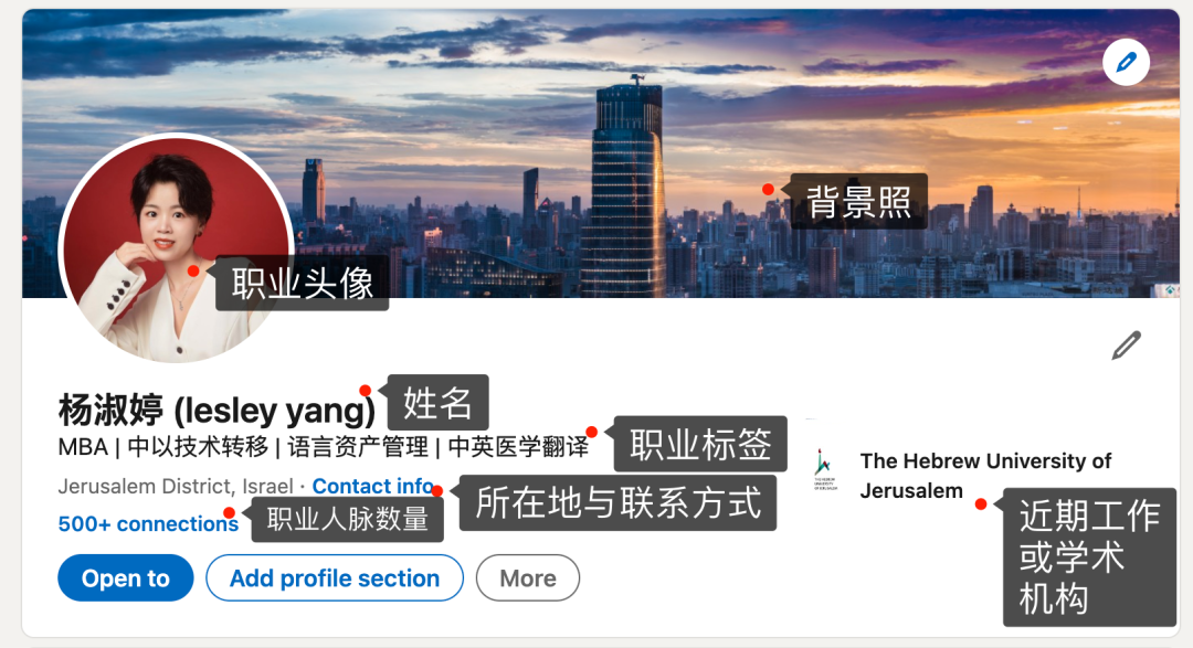 背景图:很容易被忽略的基本信息。背景图尽量选择容易和职业关联的场景。例如译员可以选择自己参会翻译的高清横向图作为背景。