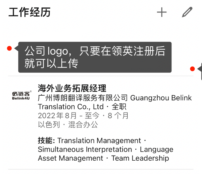 ✋使用关键词:使用与你的领域和行业相关的关键词和短语,这将使你更容易被招聘人员和其他用户找到。(比如善于某一领域翻译的译员,一定要用关键词及时被发现)