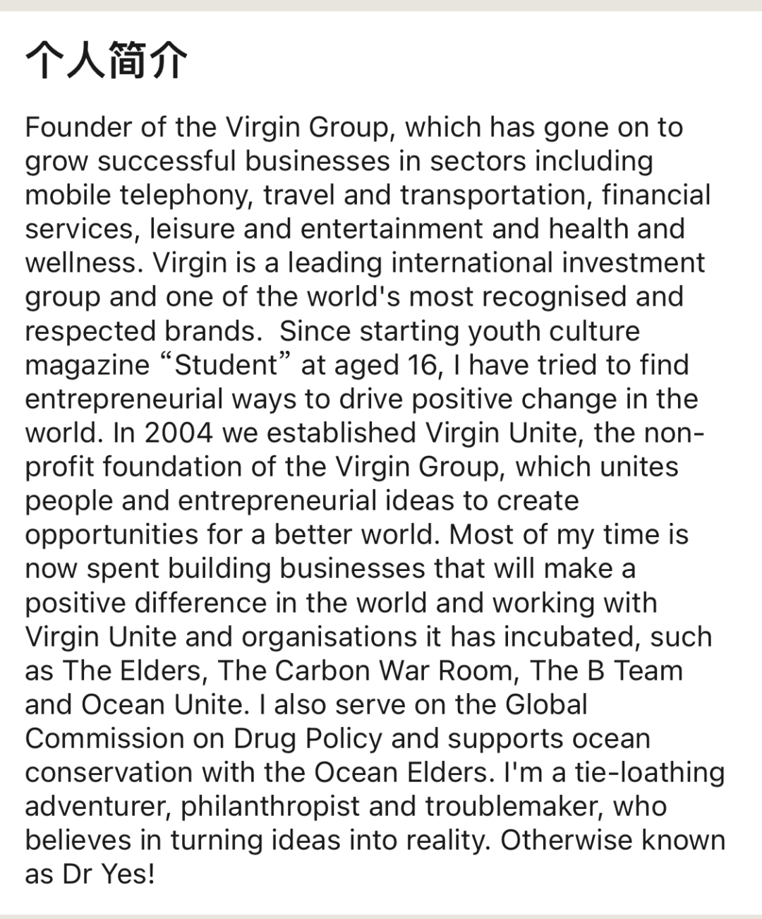 英国**企业家、维珍集团创始人Richard Branson的个人简介简洁明了,突出了自己的创业经历和个人风格。可以仿照同行大神的写法,但不要抄袭!突出自己的个人特点和专业技能更为重要。领英不含自动翻译功能,我们建议用双语写这部分内容。想写好你的个人简介,但是又怕外语不好吗?别担心,找博朗帮你润色或者翻译呀!